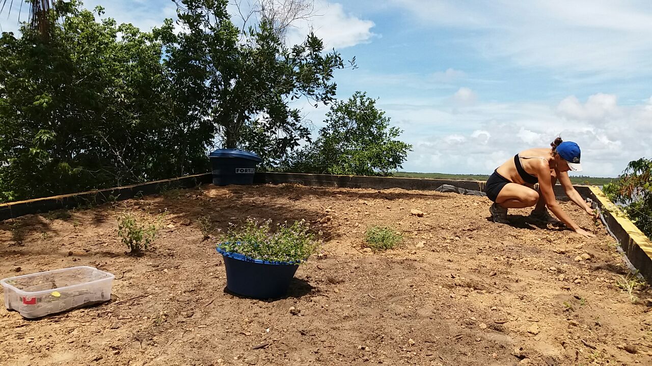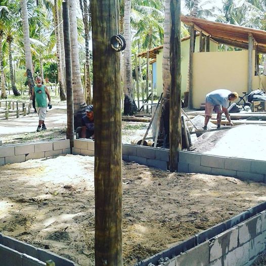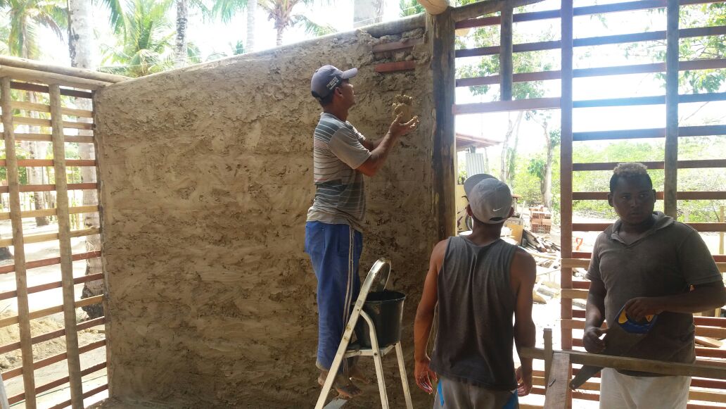 “Gostei do barro arenoso com teor de argila pra dar liga. Fizemos o preenchimento de algumas paredes e ensinei a preparação de um reboco natural. Percebemos também que aqui na região antigamente construíam muito com terra porque era o material que se tinha disponível. Claro que antigamente as construções eram mais rústicas, as casas eram construídas com amarras ao invés de usar as ripas de madeira já cortadas. Também usavam o pau mais bruto na estrutura da casa. Retomar a técnica com aprimoramentos da bioconstrução devolve ao lugar uma harmonia original, ressalta a arquiteta.
