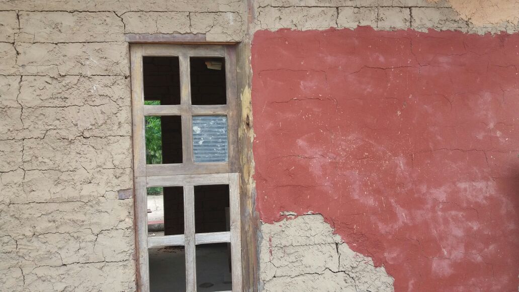A primeira camada do reboco foi uma mistura de terra, cal, esterco, serragem. Após secar bem, a segunda camada foi feita com terra, esterco, óleo de canola e grude de polvilho.