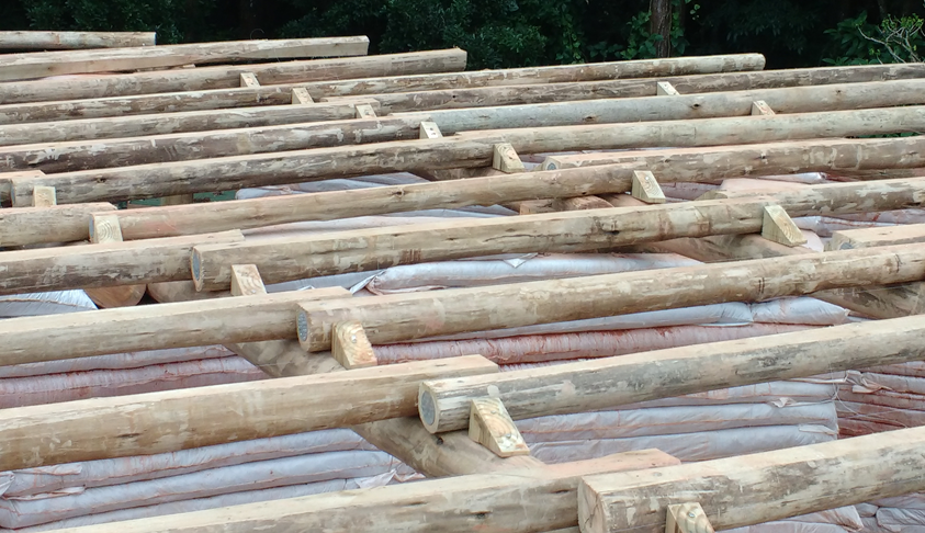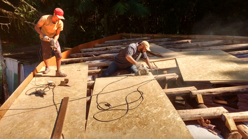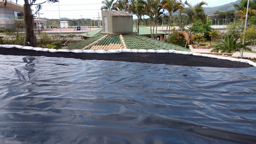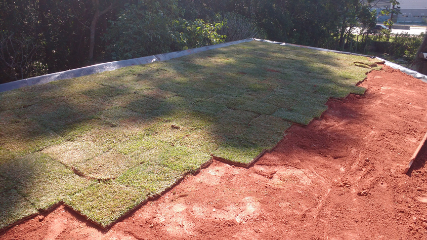 O telhado vivo foi construído com o objetivo de fornecer ainda mais conforto térmico e acústico ao ambiente interno, além de sua estética. Foi feito a partir de um assoalho de OSB (algomerado de pinus), disposto sobre uma base de madeira de eucalipto roliço tratado. Sua impermeabilização foi feita utilizando-se uma manta PEAD (polietileno de alta densidade), a mesma utilizada em aterros sanitários industriais. Por sobre a manta, foi colocada uma camada de terra (5cm) e posteriormente plantada grama do tipo esmeralda. Objetivando-se embelezar ainda mais a cobertura viva, pequenas ilhas de flores foram construídas, utilizando-se pneus usados como estrutura de apoio.