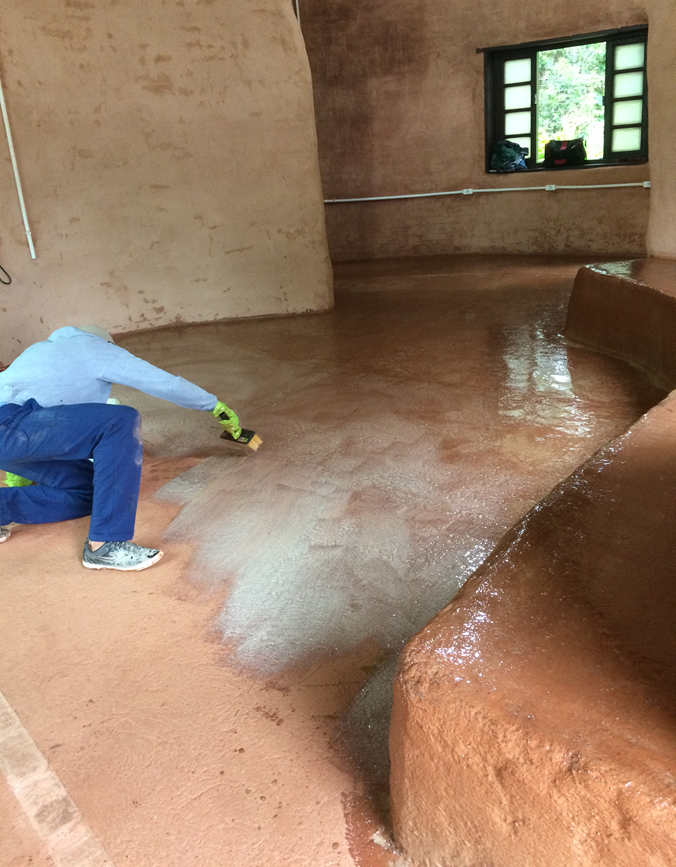 No lugar da cerâmica, por sobre o piso, assim como em toda a área molhada da edificação (cozinha e banheiros), foram aplicadas 02 a 03 demãos de resina 100% vegetal à base de mamona, objetivando-se impermeabilizar as superfícies e também evitar o seu desgaste físico proveniente de limpeza ou atrito sobre o solo.