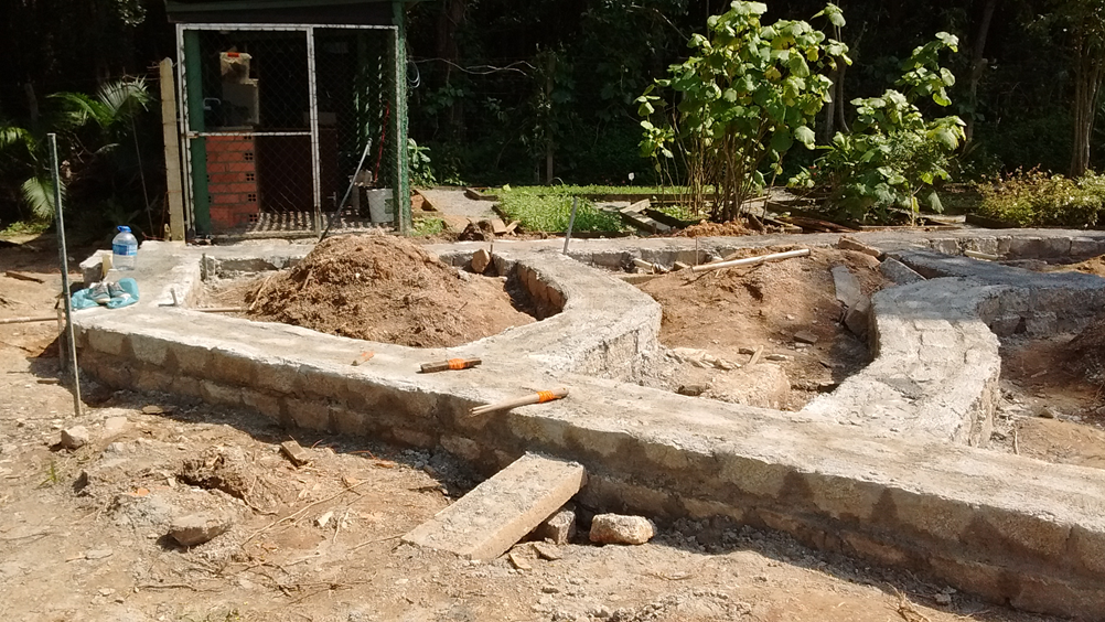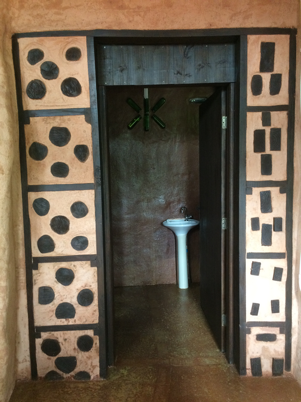 Paredes do tipo ferro-solocimento e cordwood (barro com madeira) também foram utilizadas neste projeto para a construção das divisórias internas (banheiros).